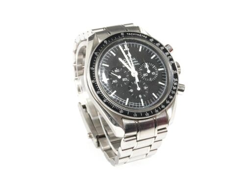 | RANNEKELLO OMEGA SPEEDMASTER PROFESSIONAL THE FIRST WATCH WORN ON THE MOON MEK (M) LV EI KAIV, REF 311.30.42.30.01.005 N:O 77763008, 5 RANNEKKEEN LISÄPALAA, KÄYTTÖKULUMAA JA NAARMUJA, KOTELO VIALL JA OHJEKIRJA |